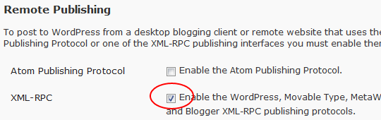 1. 在Wordpress设置 Remote Publishing ,比须勾选 XML-RPC publishing interfaces。