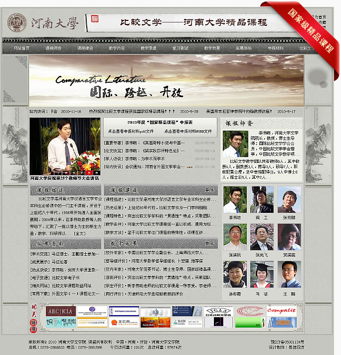 比较文学被评选为2010年度国家级精品课程,本课程是河南大学汉语言文学专业本科生必修课中的一门主干课程,开设于上世纪八十年代,1998年开始进入全面发展期,2004年以来,在李伟昉教授等人的带动下,汇聚了一批以博士为主的新生力量,教学、科研得以大力提高,走在了国内前列。