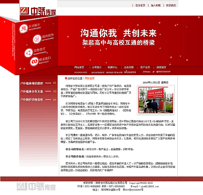 河南省中骄传媒文化有限公司是一家集户外广告媒体、电视媒体投放、产品广告代理于一体的综合型广告公司,并涉及教育事业,拥有自己独特的校园宣传网络。同时本公司有自己的包装厂及不锈钢制品厂。