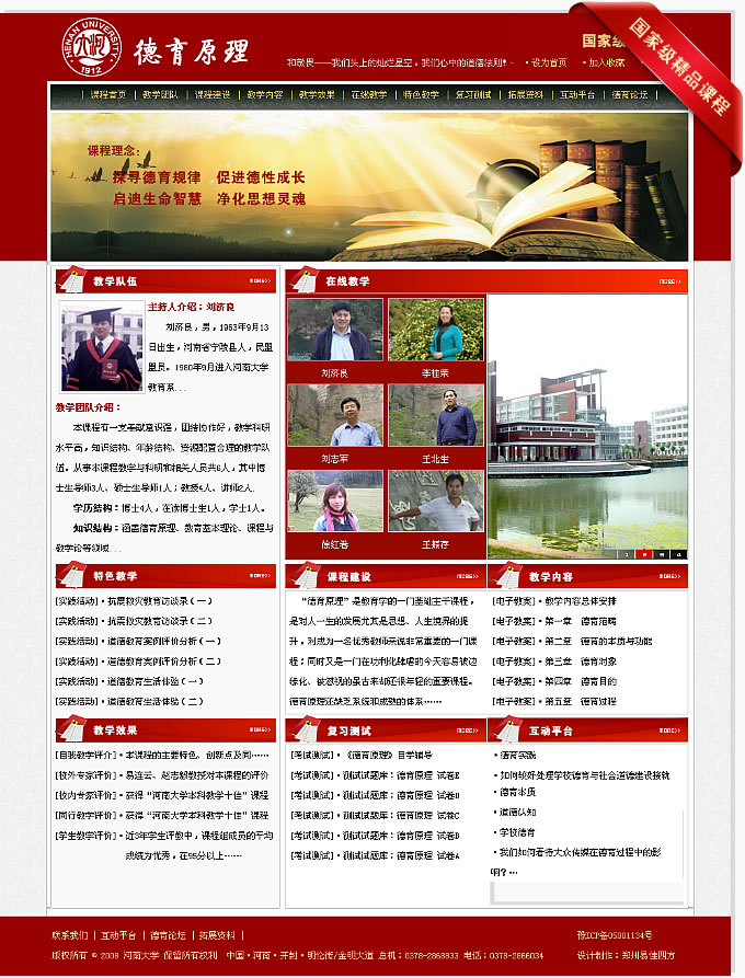 河南大学德育原理课程被评选为2008年度的国家级精品课程,本课程有一支奉献意识强,团结协作好,教学科研水平高,知识结构、年龄结构、资源配置合理的教学队伍。从事本课程教学与科研和相关人员共6人,其中博士生导师3人、硕士生导师1人;教授4人、讲师2人。